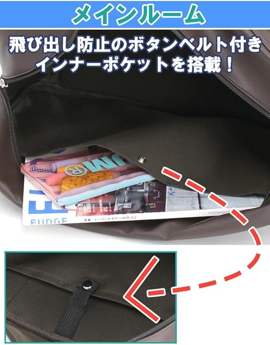 メイン収納には、荷物の飛び出しを防ぐボタン式ベルトが付いたポケットと、ペットボトルや水筒などを固定できるボトルポケットも◎