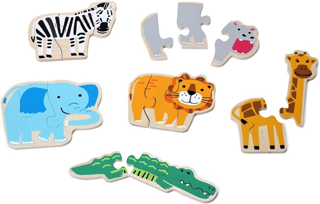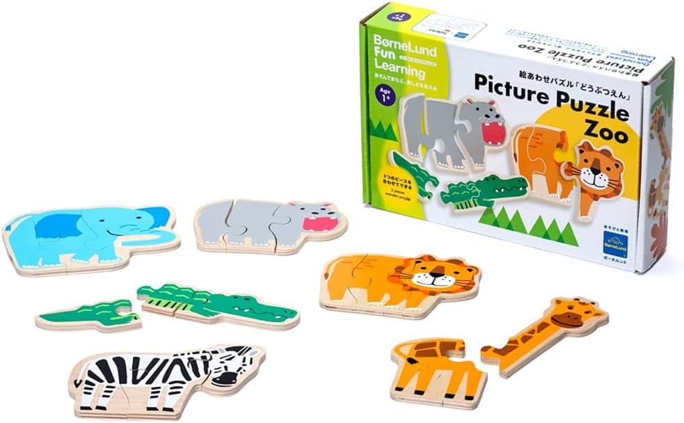 ■セット内容:木製パズル6種(ライオン、しまうま、ワニ、ぞう、カバ、キリン 各3ピース)
