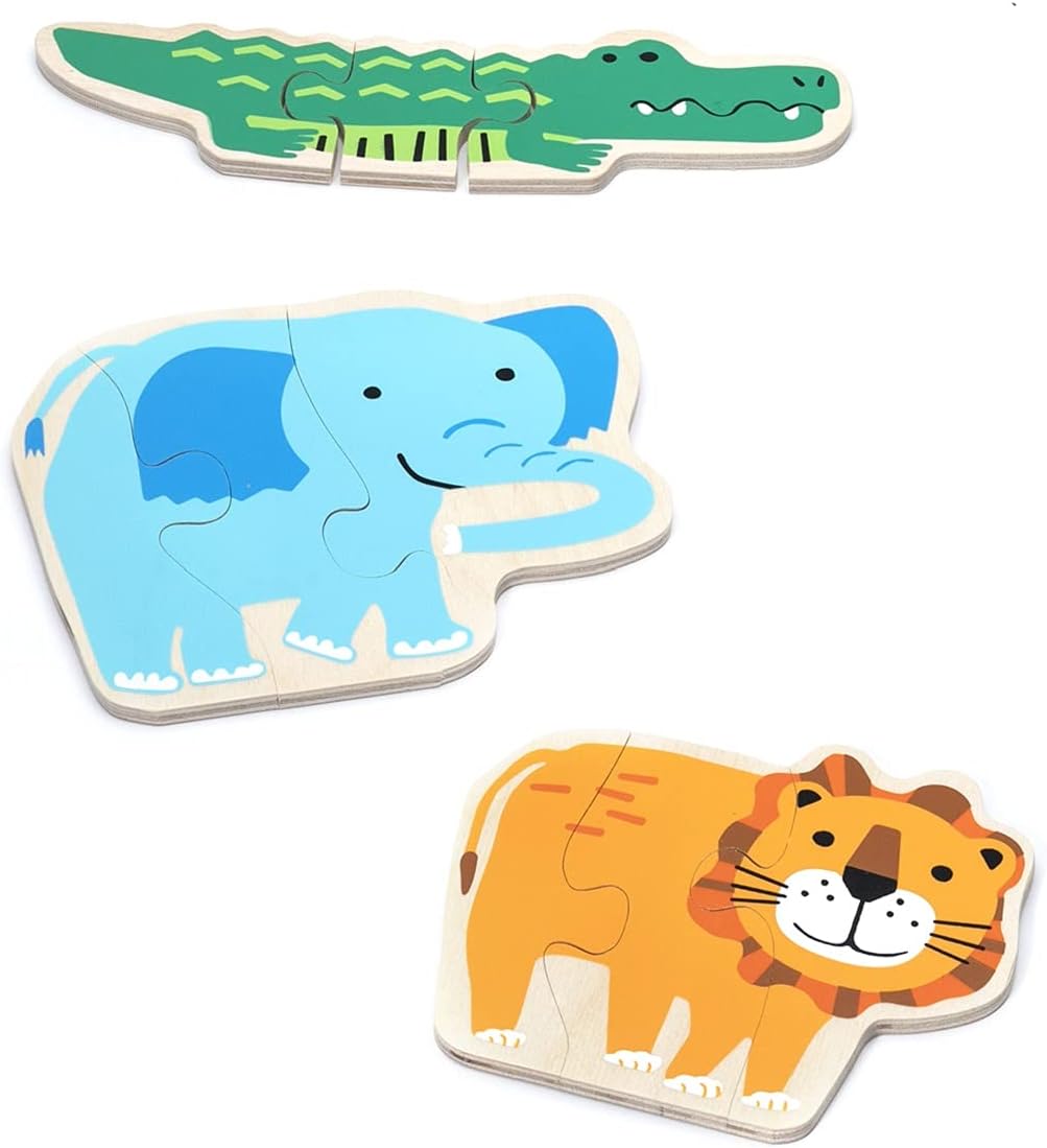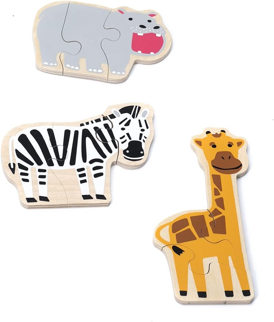3ピースでつながる木製ジグソーパズルです。型はめの次に挑戦するのにぴったりなピース数で、わかりやすい動物が描かれています。