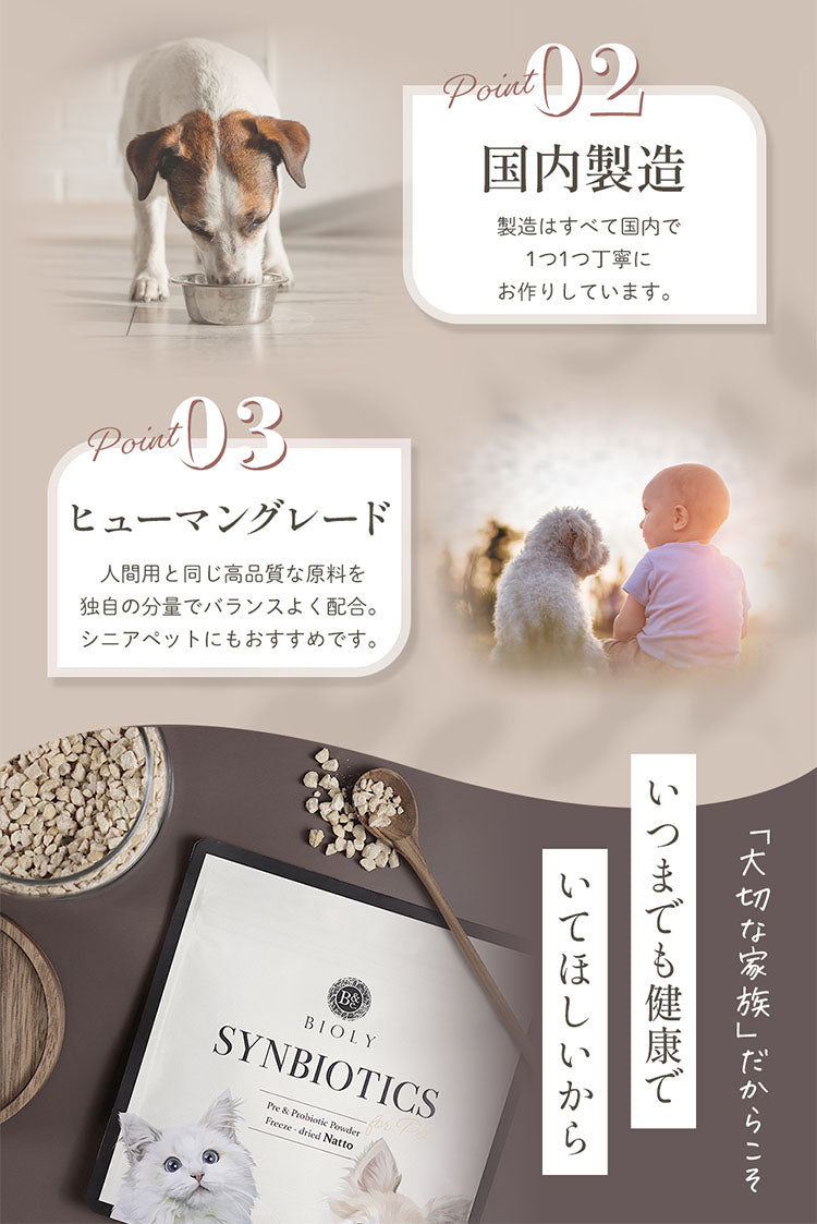 BIOLYのペットサプリメントは『ヒューマングレード』人間用と同じ品質の原料を採用。フリーズドライ納豆・菊芋粉末・乳酸菌のいずれも人間が摂取しても問題のない良質な原料を使用しています。