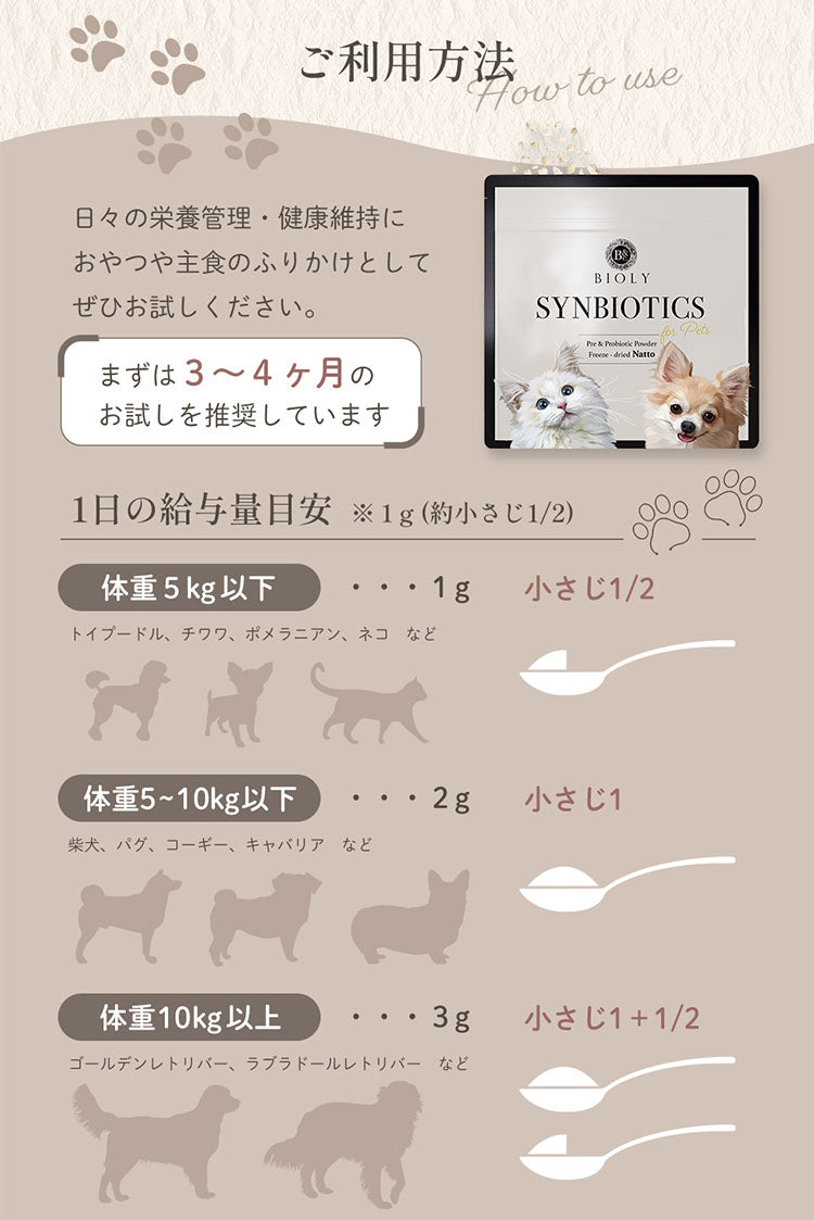 BIOLYのペットサプリメントは、大切なペットの身体に負担の無いよう添加物は使用せず、素材をそのまま生かして仕上げております。日々の栄養管理や健康維持のためにも、主食やおやつと一緒にぜひ取り入れていただきたいです。