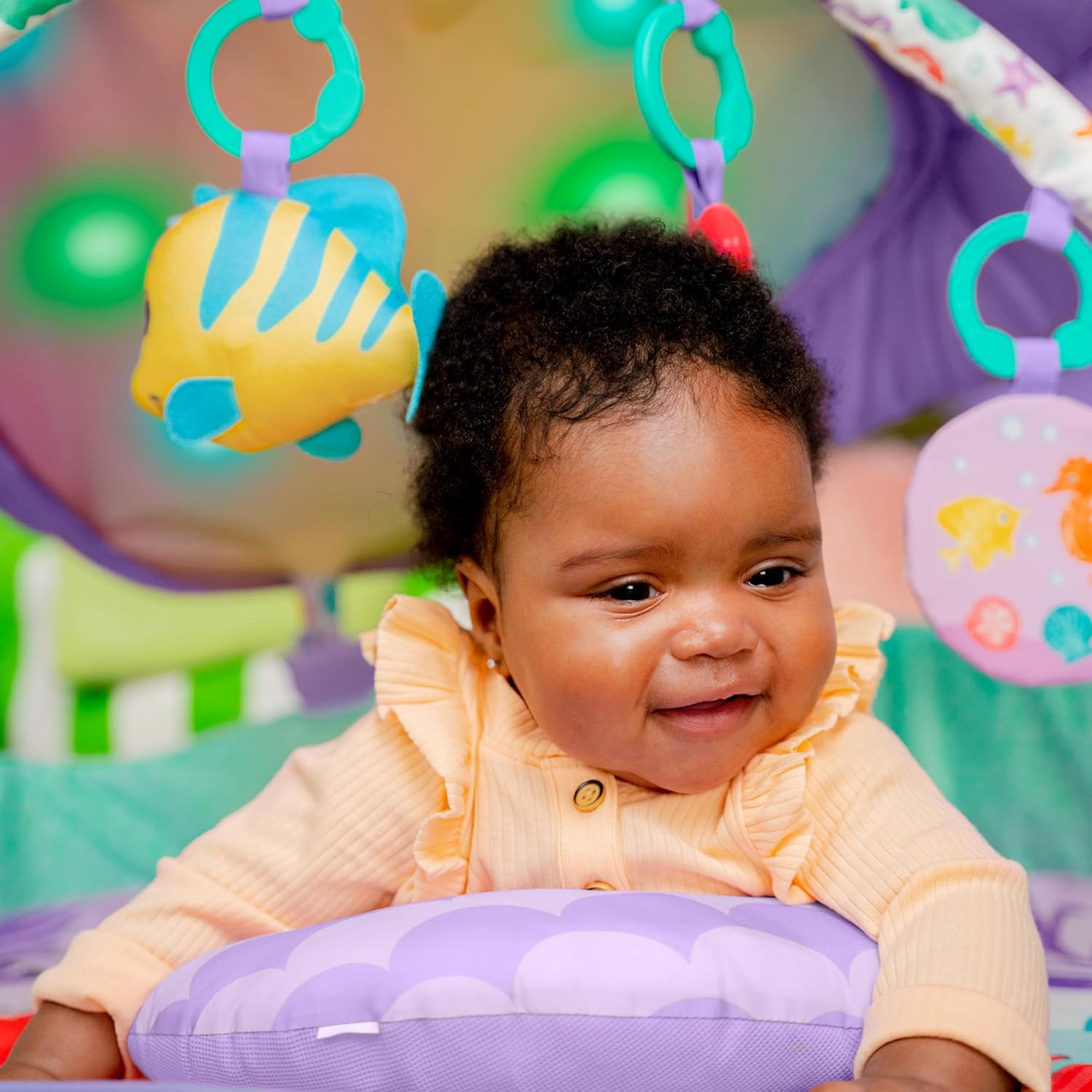 ディズニー ライト&ミュージカル・アクティビティジム・リトルマーメイドで水中パーティーを開こう!アリエル、セバスチャン、フランダーと一緒に、トロピカルなメロディーとキラキラ光るオーシャンライトの世界で、キラキラと輝く虹色の貝殻の下で遊びましょう。このベビージムでは、おもちゃを取り外して外出先でも遊べるように、たくさんの仕掛けを用意しています! 紫のクッションは、サンゴ礁。赤ちゃんの腹ばい遊びの時間が楽しくなります。