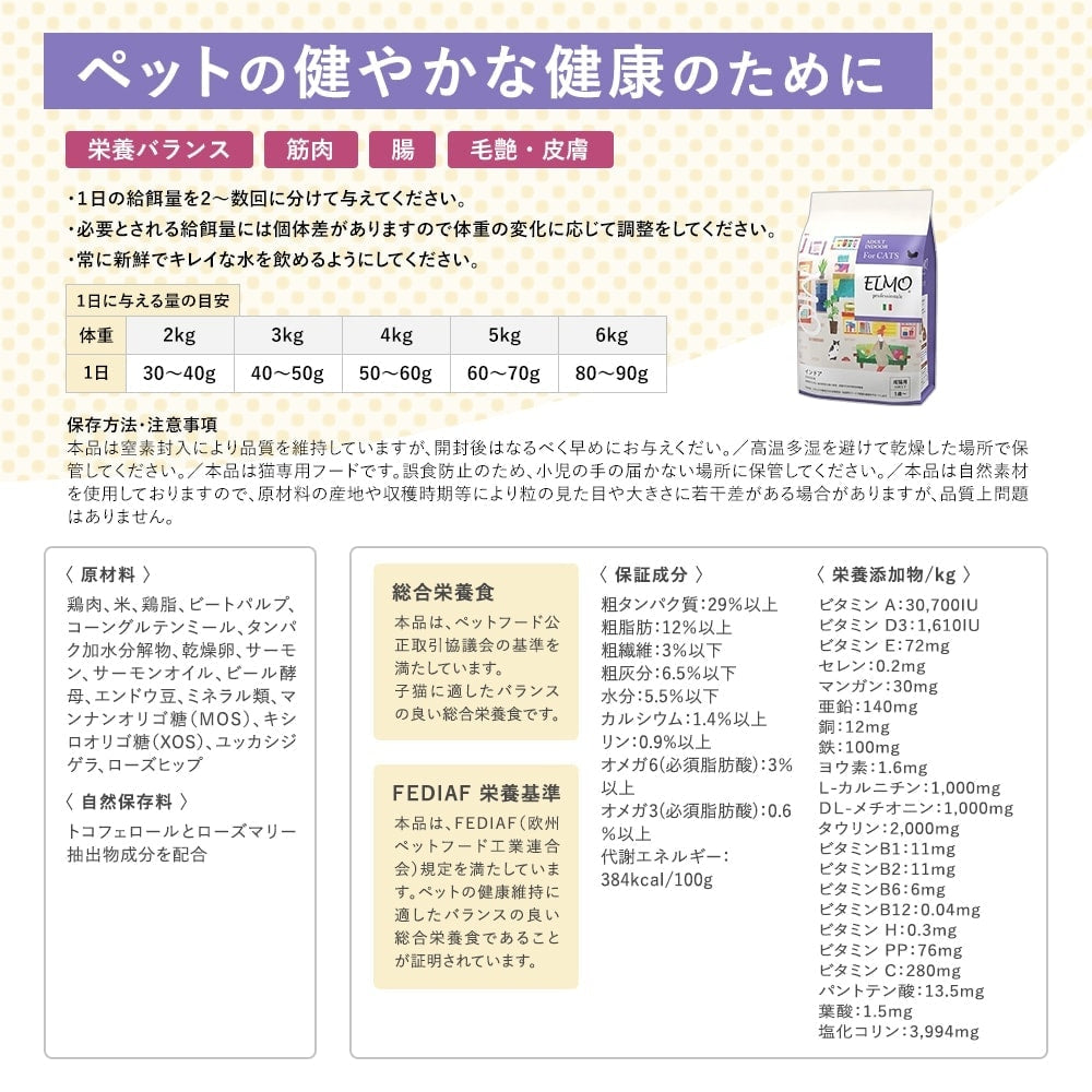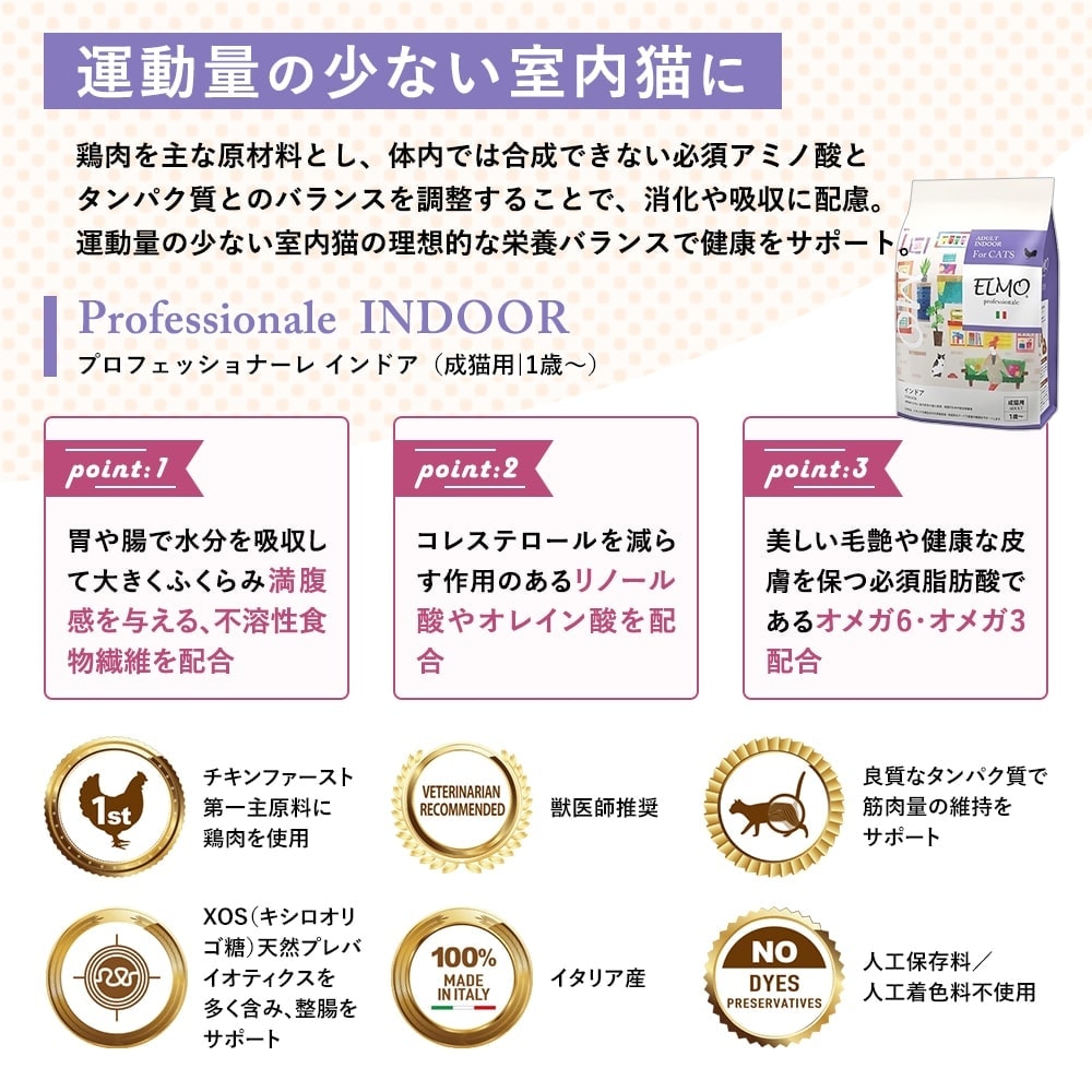 [ ELMO ] エルモ プロフェッショナーレ インドア 〈400g〉 アダルト 成猫用 1歳運動量の少ない室内猫に。 特徴☆胃や腸で水分を吸収して大きくふくらみ満腹感を与える、不溶性食物繊維を配合。 総合栄養食本品は、ペットフード公正取引協議会の基準を満たしています。 FEDIAF 栄養基準本品は、FEDIAF(欧州ペットフード工業連合会)規定を満たしています。ペットの健康維持に適したバランスの良い総合栄養食であることが証明されています。
