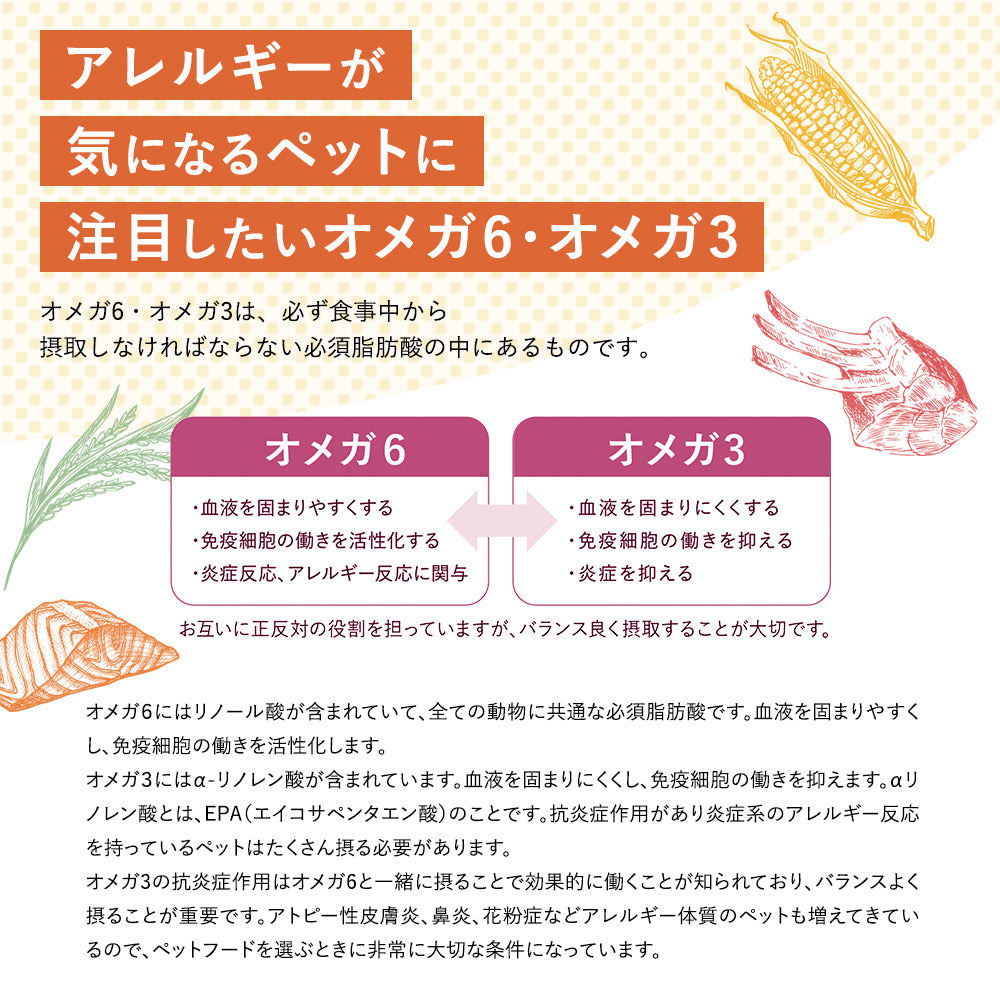 鴨肉とポテトを主な原材料とし、アレルギーの原因となる穀物を一切使用せず、余分な脂肪が体内に蓄積されにくい鴨肉を使用。 食物アレルギーの発症リスクを最小限に抑えながら、生活習慣病の予防・改善に配慮して健康をサポートします。