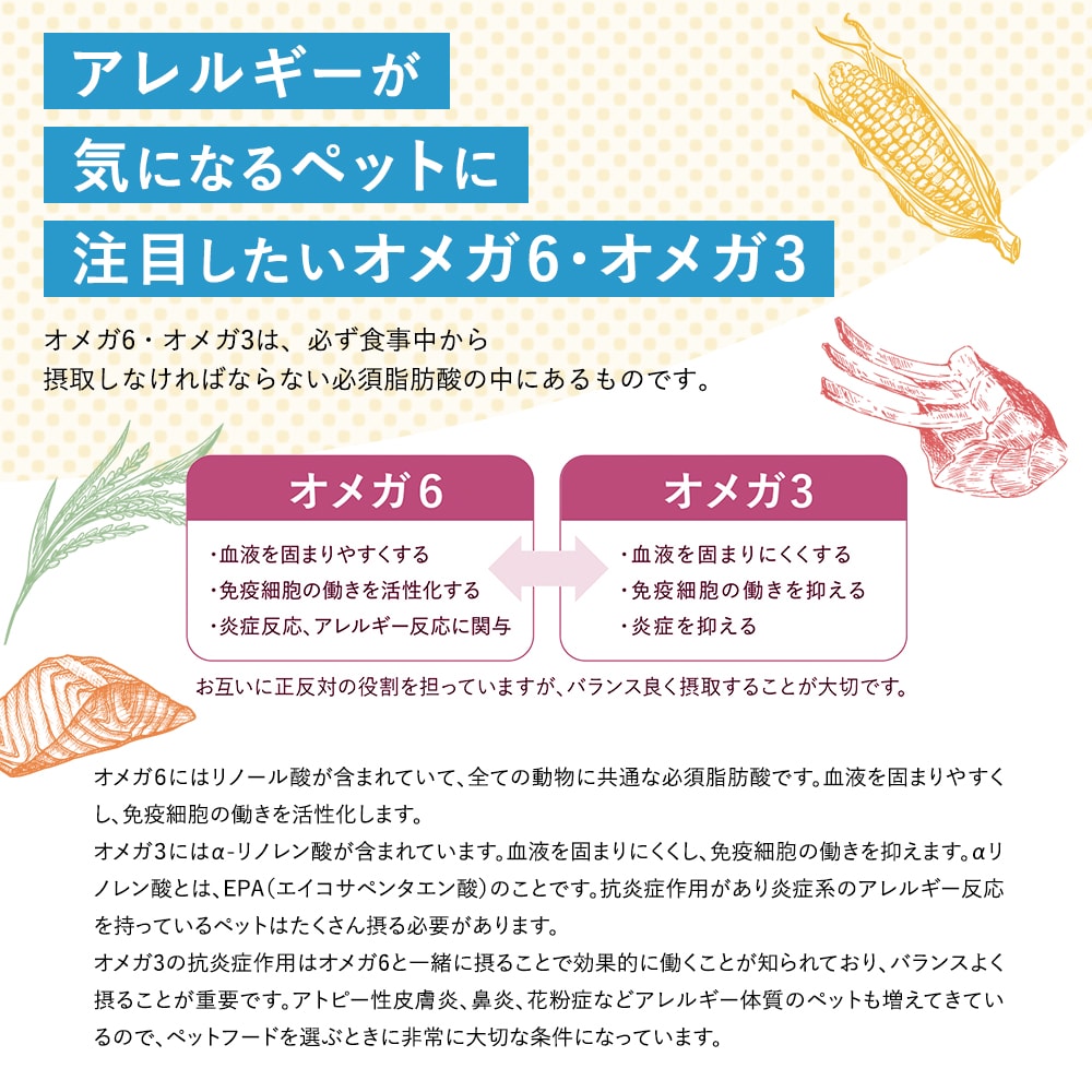 | 保証成分 | 粗タンパク質:26%以上/粗脂肪:14%以上/粗繊維:2.5%以下/粗灰分:6%以下/水分:8%以下/カルシウム:1.2%以上/リン:0.8%以上/オメガ6(必須脂肪酸):3.8%以上/オメガ3(必須脂肪酸):0.7%以上/代謝エネルギー:405kcal/100g |