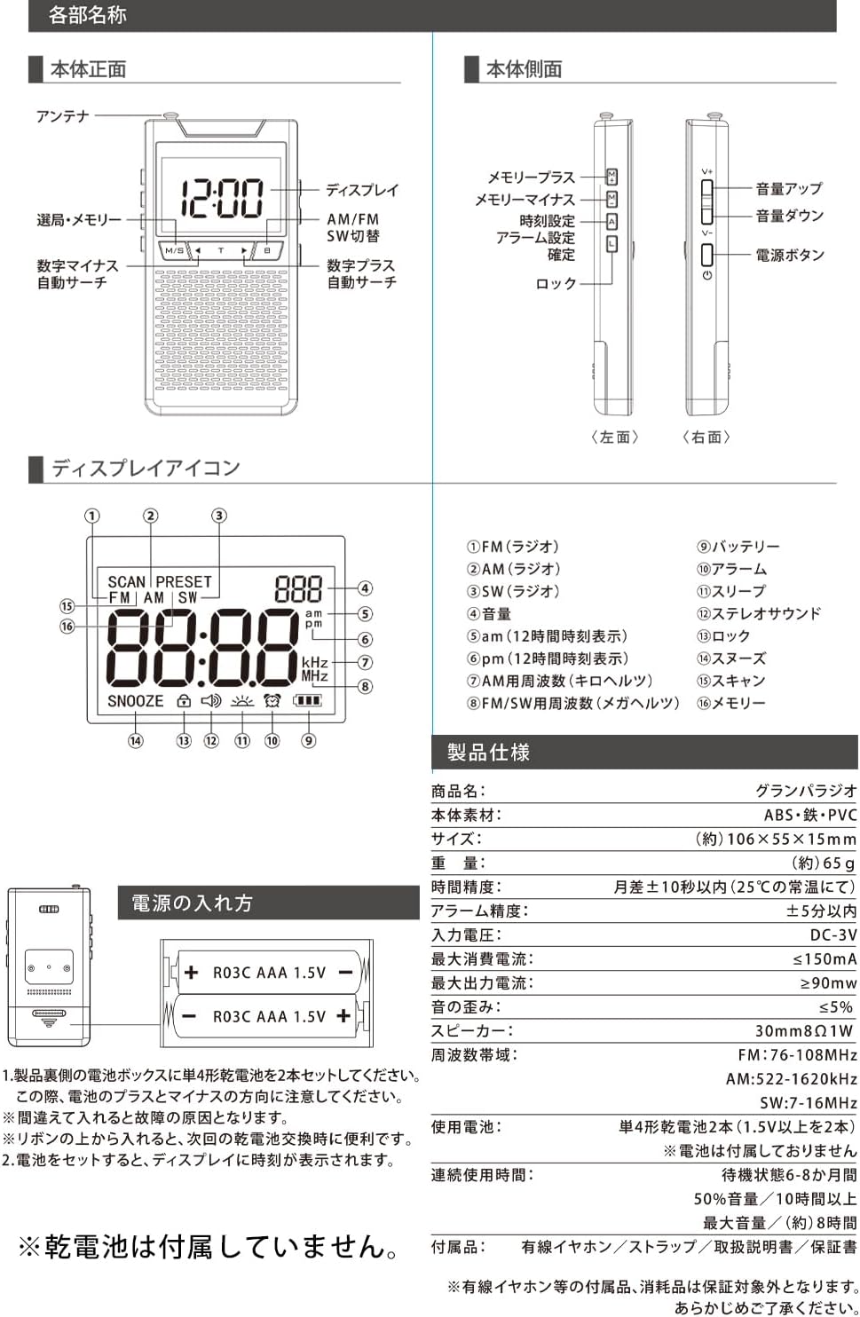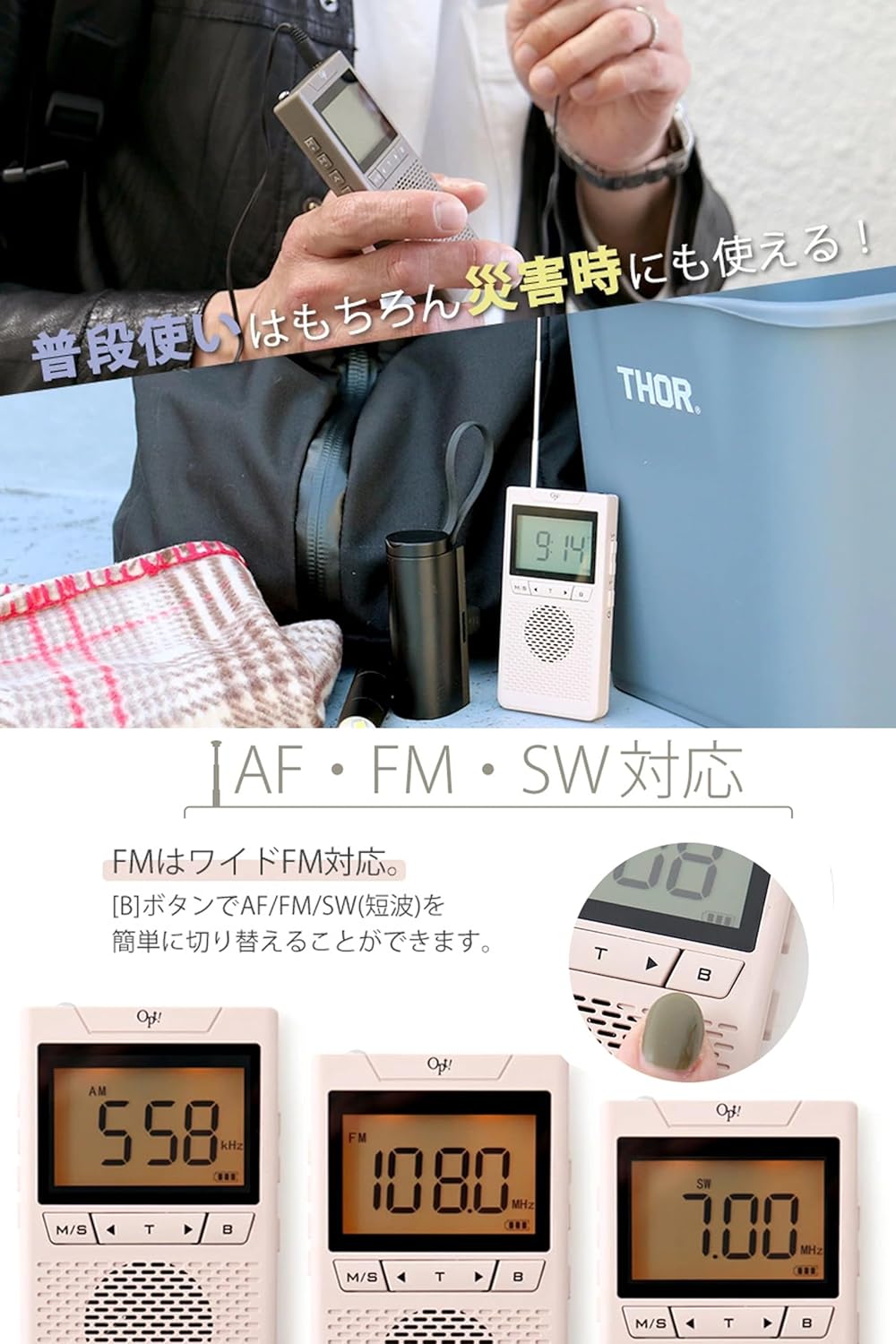 | 周波数帯域 | FM:76-108MHz、AM:522-1620kHz、SW:7-16MHz |