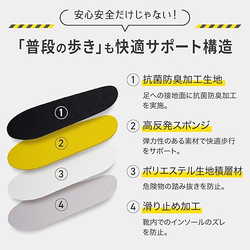 ・安全靴のJIS規格に基づく素材を採用 JIS規格(T8101)耐踏抜き性試験に合格しており真下からの危険物の踏み抜きを防ぎます。 おおむね、体重100kgの人が、釘の尖った側に片足立ちをしても貫かない頑丈さです。 ※耐荷重100kg(耐踏抜き性試験の結果をもとに算出)